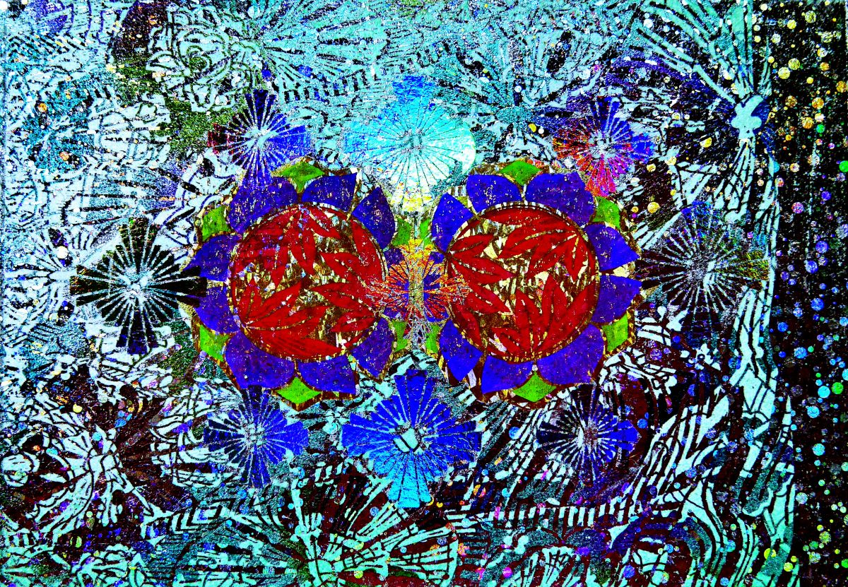 この作品のように大半がホログラムの箔シートで出来ていると、光線の角度によってある部分は反射し、ある部分は黒っぽく写る。 光線の角度だけを変えると、又違った部分が光る。 赤の発色が悪いのでデジタル処理すると、全体的に赤くな … Read more