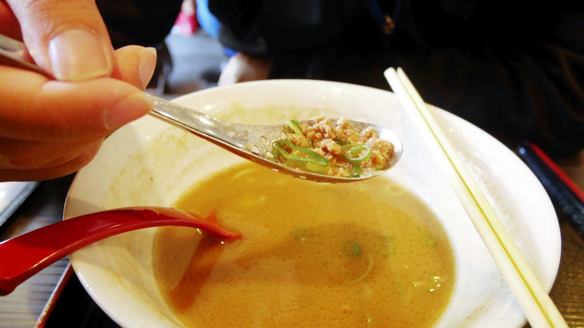 なんと、底にミンチ肉が沈んでいた。息子は、豚骨味の大盛りラーメンを完食して大満足の様子。無しかに80円高いだけのことはあった。個人的意見ではあるが、「天下一品」より「大阪きんせい」の方が、総ての点で上のように感じた。