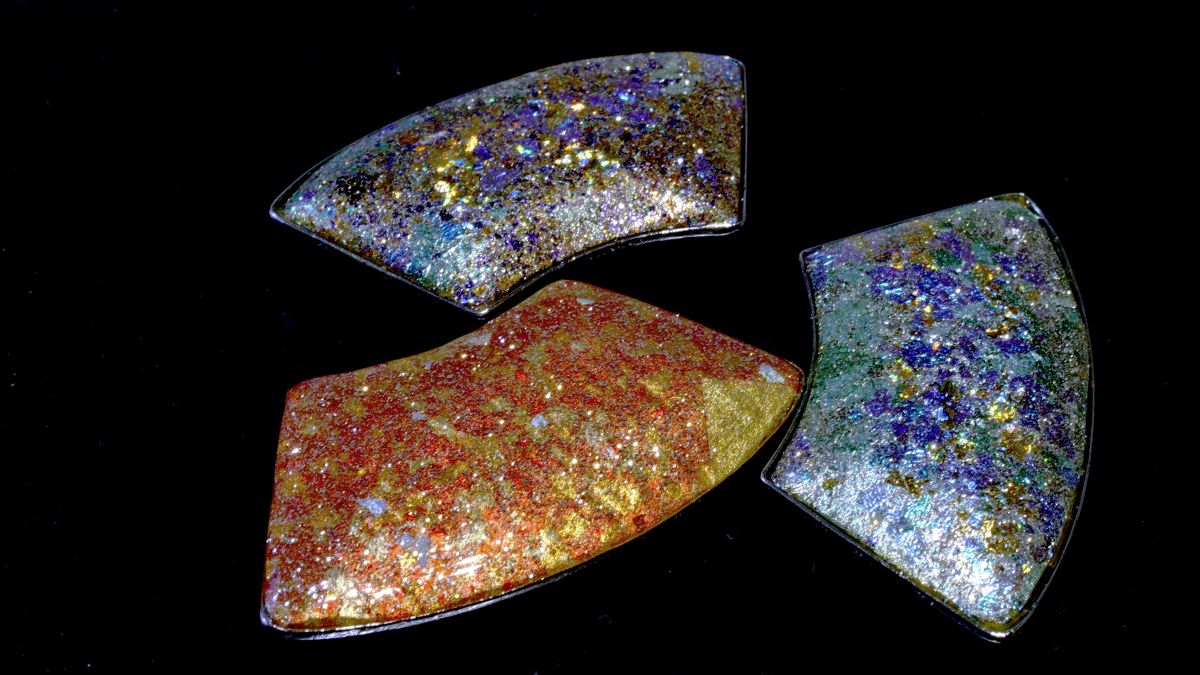 扇型のアクセサリー 2014/10/12 by 山﨑 惠水 扇の形か好きなので、まず自分のために扇形のアクセサリーを作り始めた。台は七宝焼きの金属台を使う。 これは扇形のブローチ。コート剤は2液性のエポキシ樹脂。 扇形のループタイ。ループタイはたくさん作った。箔のループタイは男性よりも女性にうけた。総て20年以上も前のことである。