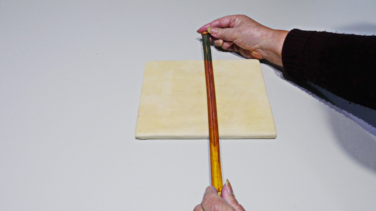 裏からだとこのような具合に持つ。本当に箔を切るときはひっくり返して左側の竹の皮の部分を使う。