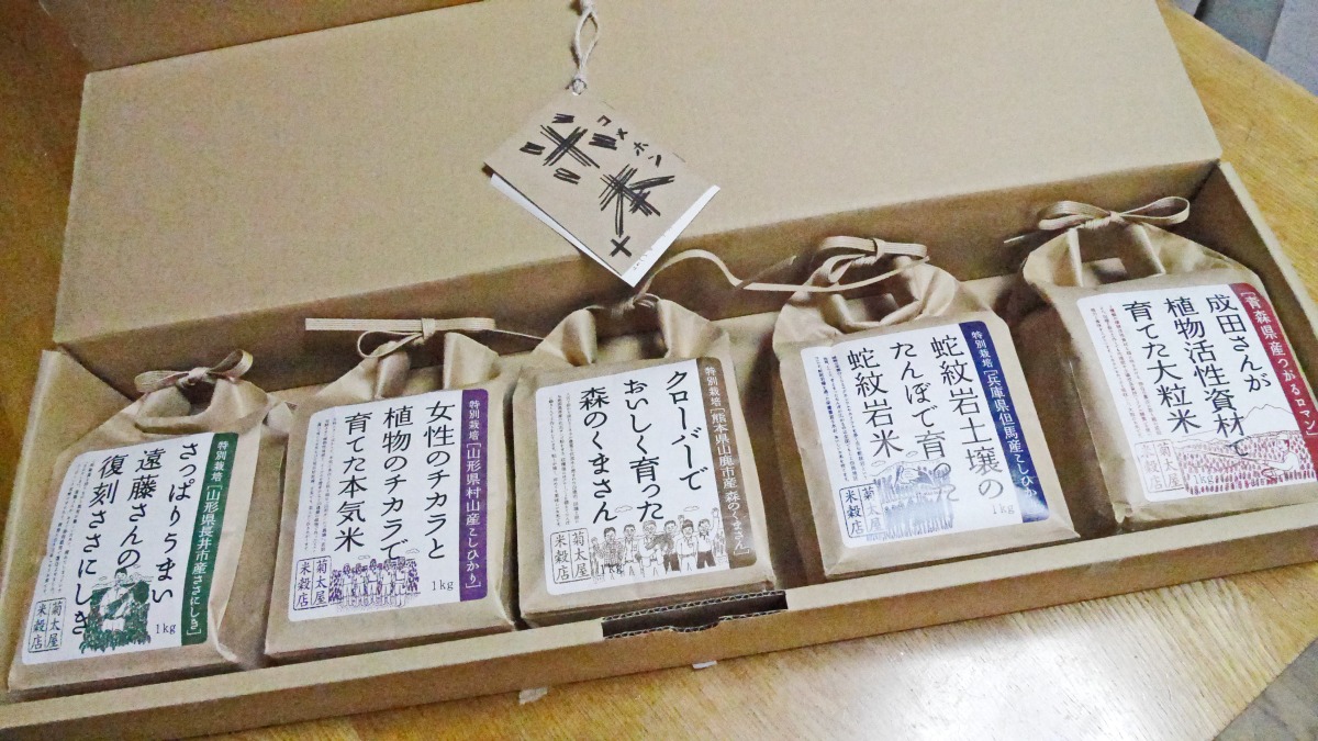 1キロ入りの5銘柄の詰め合わせセットである。玄米をお客の注文で精米するそうである。我家の場合、玄米のままのほうが良かったのだが、たまには白米もいいかな。炊き込みご飯は、玄米では出来ない。ちらし寿司なんかも白米の方がいい。