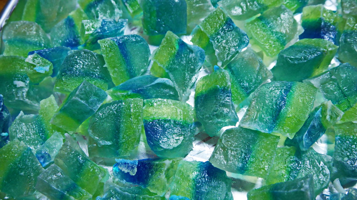 前回、3層の琥珀糖を作って切り分けるところまでブログに書いた。で、その後どうなったか。 なかなかカリッとしない。完全に乾燥するのに約10日間かかった。その間、味見と称して、3割ぐらい食べてしまった。 結論から言うと、途中 … Read more
