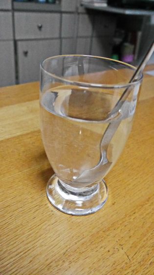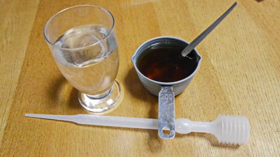 アルギン酸ナトリウムは、急激に水分を吸うので玉になってなかなか均一にならない。それで、かき混ぜ続け無くてはならないが、一晩おいておくと楽に水に溶ける。濃度は3%程度の水溶液を作る。かなりドロッとした状態である。とんかつソースぐらいかな。