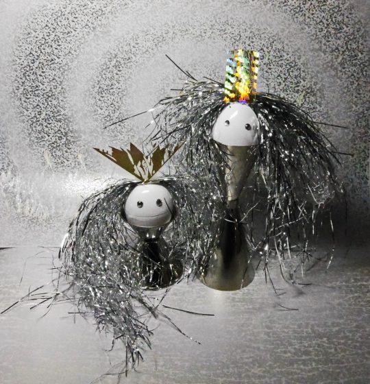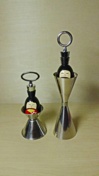カクテルの計量器で作り直したお雛様 2017/03/02 by 山﨑 惠水 先日、カクテルの計量器で作っさお雛様。 金属的な感じで統一したかったので、もう一度作り直すことにした。 お雛様。 内裏様。 髪の毛と髪飾りに苦心した。 はい、記念撮影。 バックを変えて、もう一枚、パチリ。