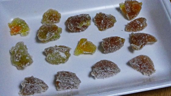 左が乾燥させて作った分担ピール。右がネタネタのときのグラニュー糖をまぶして作った分担ピール。圧倒的に右のジャリジャリのほうが美味しい。
