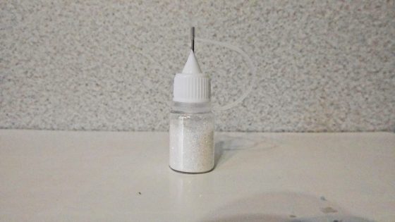 このようにして、よく使うグリッターはコーナンで買ってきたオイル入れに入れて使っている。筒の出口はグリッターの大きさによってハサミでカットして使っている。