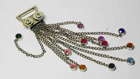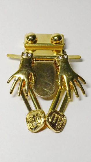 アクセサリーやバッグのパーツを組み合わせた。接着剤で付けてもすぐに剥がれる。金属だし、ハンダ付けの方がいいような気がする。