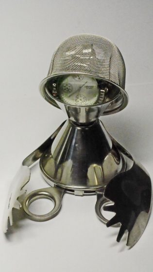 壊れた腕時計、エッグカッター、サラダトング、カクテルの計量カップ、茶こし編み。これはストラップではない。頭の運動に良いかもしれない。