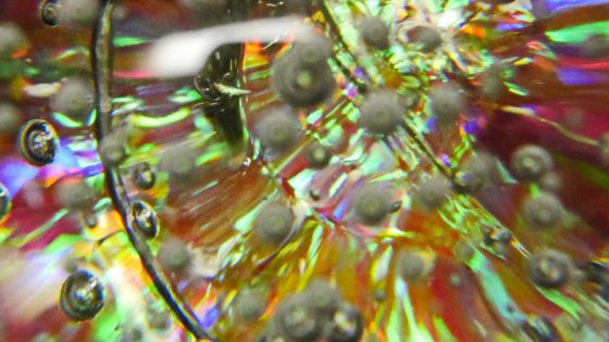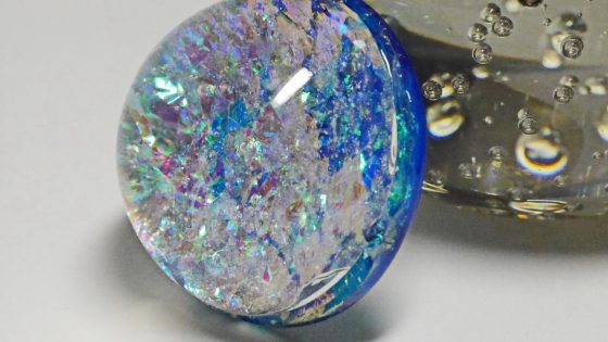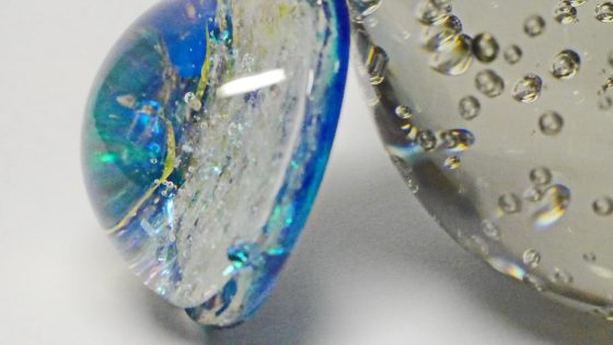 今度は、泡の入ったガラスの球を透かしてレジンオブジェを見てみる。