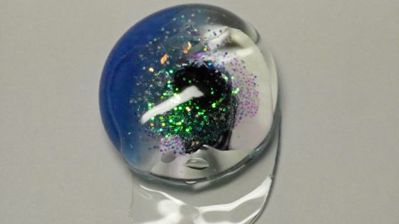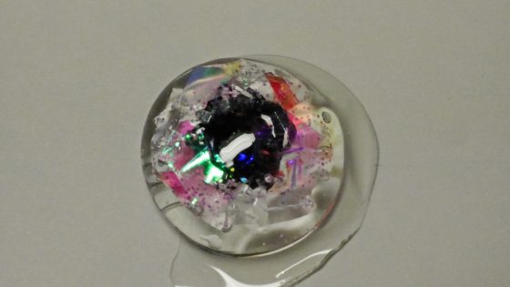 UVレジンを垂らしたらおはじきからはみ出てしまった。いつもなら、ハサミで切り取るところではあるが、涙ウルウルのようで面白いのでそのままにしておく。