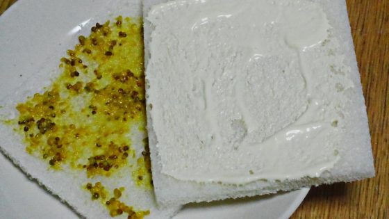 それならばと、一方のパンには辛子、もう一方にはマヨネーズを塗ってきゅうりを挟んでみる。