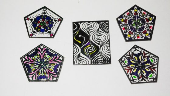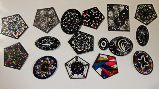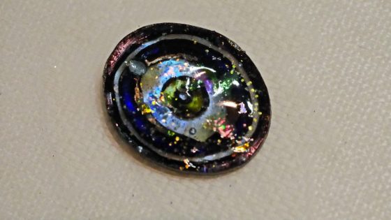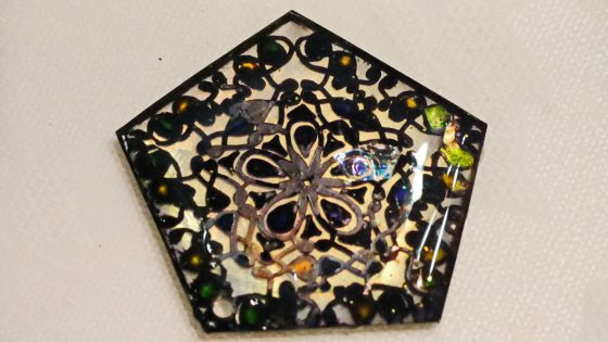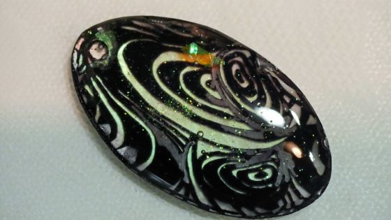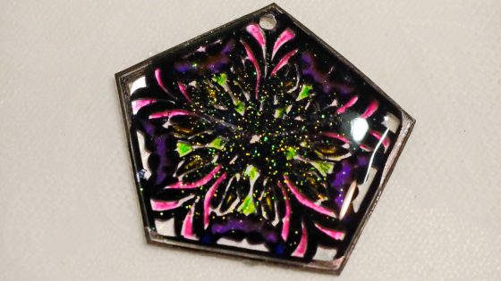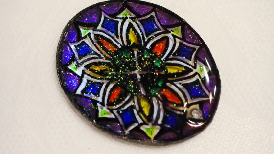 黒のマジックはくすんで汚いので上からUVレジンを置いて光硬化させると、ピカッと光沢が出て美しくなる。この場合は少しグリッターを部分的に加えてみた。