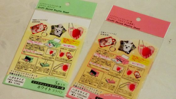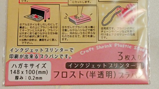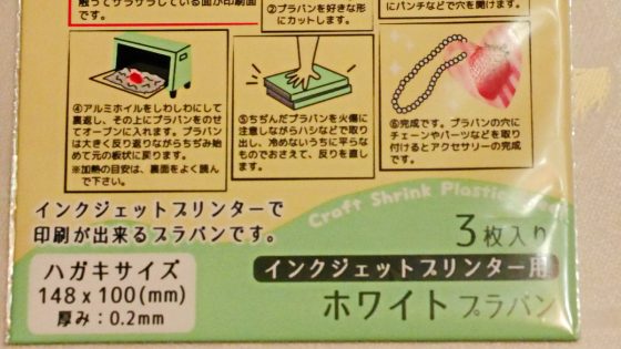 ロングセラーのプラバン(プラスチックの板)ではあるが、縦横の伸縮比率が違ったり、PCのプリンターではそのまま印刷できなかったりと問題があった。しかし、最近、改良され問題点は値段だけとなったが、100均の店頭に並ぶようになってすべての問題は解決された。