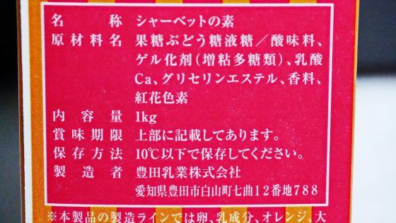 家では上手く作れないシャーベット。一体何が入っているのか。ゲル化剤と乳酸カルシウムとグリセリンエステルがその秘訣らしい。