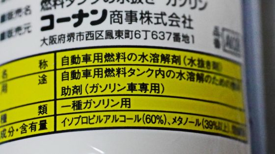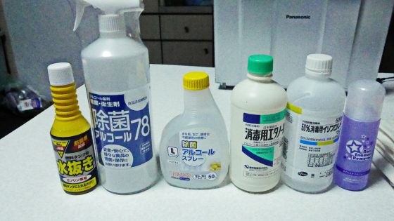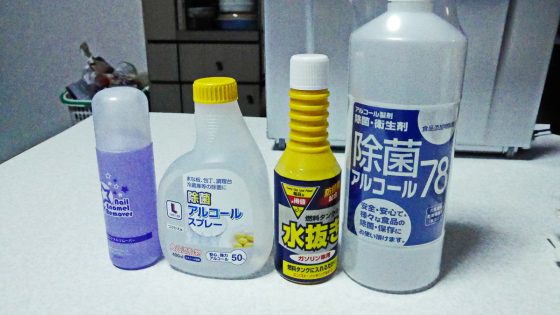 あと残ったのが右から除菌アルコールスプレー、ガソリン燃料タンクの水抜き、台所用除菌アルコールスプレー、ネイルの除光液。