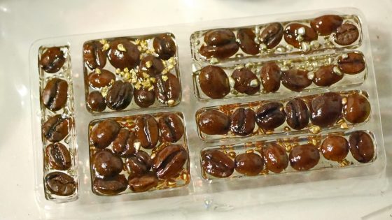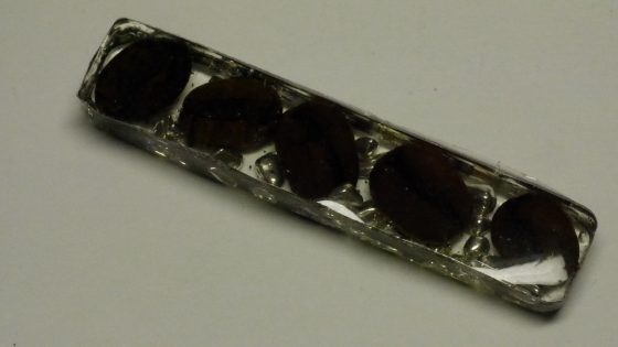 コーヒー豆を2液性のエポキシで注型しようとしたが、豆の比重がエポキシの比重よりも小さいため上に浮かんでくる。
