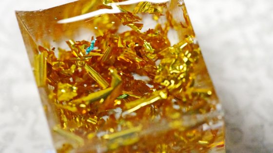 2種類の箔をミックスして入れても良い。その箔の上から2液性のエポキシ樹脂を注ぎ込む。