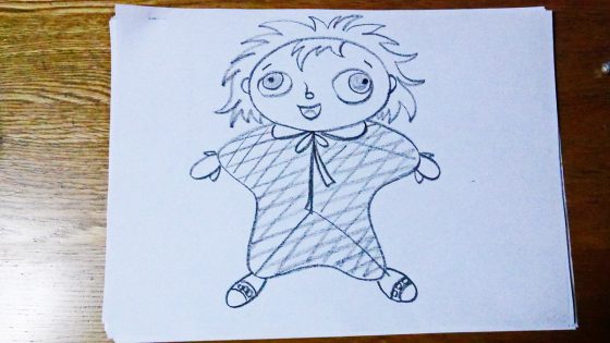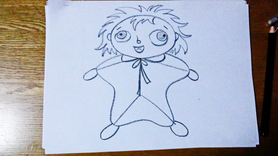 服を着せる。この曲線が描きにくい人は、兎に角ゆっくりと丁寧に引けばなんとかなる。なんともならなくてもケシゴムを使ったり、紙をくるくる回したり、細い線を何本も引いたりしては絶対に駄目である。どうしても気に入らない形になった時は、最初からやり直せば良い。