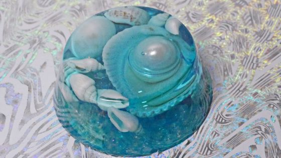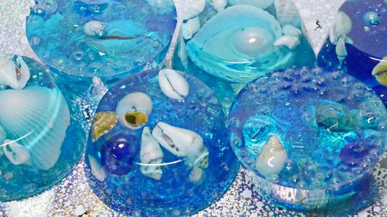 貝やビーズをギッシリ詰め込んである。来年の夏があるとして、一年前の夏を、ペーパーウエイトの中に閉じ込められた時間を見ることができるなんてちょっといいかも。