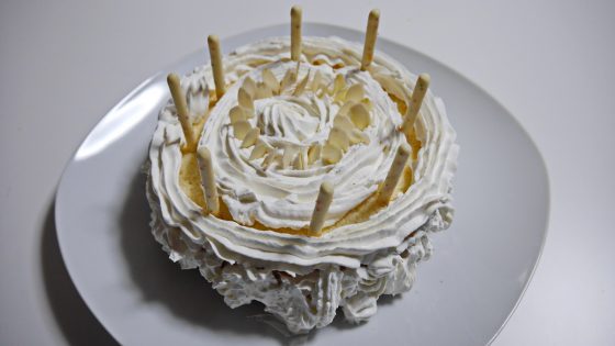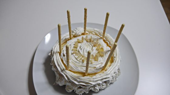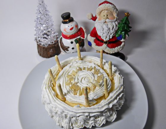 白い切り株をイメージしてホイップをデコレートして、ポッキーをロウソク代わりに突き刺す。