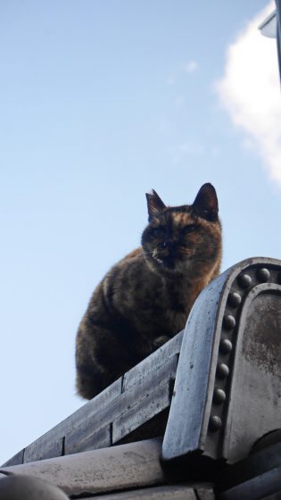 商店街の突き当りのお寺の塀の上で、何やら訴えるような鳴き声を上げている猫ちゃんがいた。