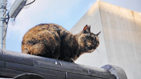 方向を変えて見ると、黒と茶のまだら模様の猫ちゃん。しかし、耳がV字型にカットされている。