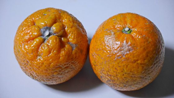見た目は小汚い皮の沖縄県産のタンカン。タンカンの中で、左側が一番見た目が悪く、右側が一番きれいなもの。