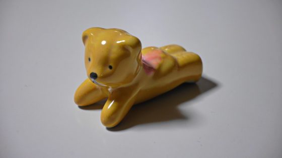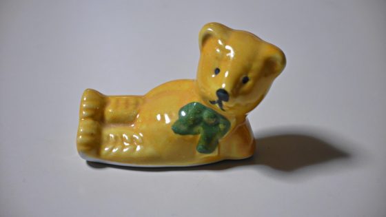 右下になったブルーのクマと似ているが、リボンの位置、首の傾け具合。膝の曲げ具合などが異なっている。きっと5種類がワンセットになっていたのだと思う。。