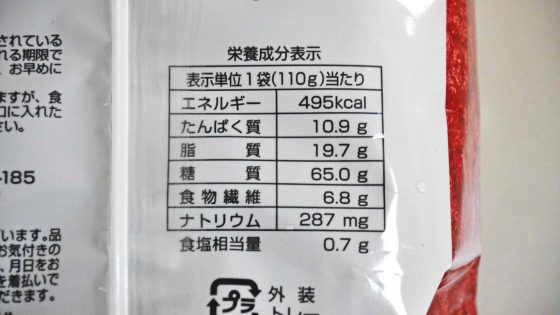 100gあたりのカロリー表示を書いている場合が多いが、これは一袋のカロリーが書いてある。良心的だと思う。