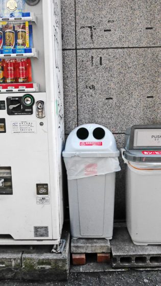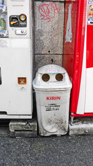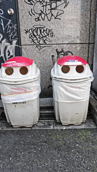 歩き疲れて、この二つ目のゴミ箱たちに出会うとなんだかホッとする。この2つ目の擬人化されたゴミ箱の発するユーモア感は、人に癒やしを与えてくれるのではないか。そのうえこのゴミ箱は自動販売機の空き瓶や空き缶専用ということもある、これらの飲料水自体が人の疲労感を和らげてくれるから尚更である。