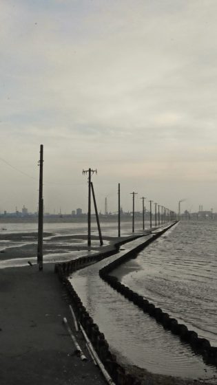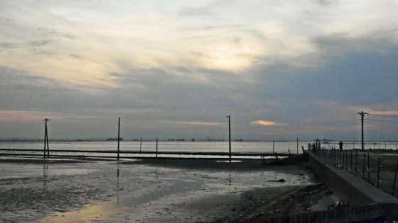 満潮の水の中に立つ電柱列の写真の素晴らしいのはたくさんあって、今更私が撮ることもないので、干潮の風景を撮ることにしたのである。