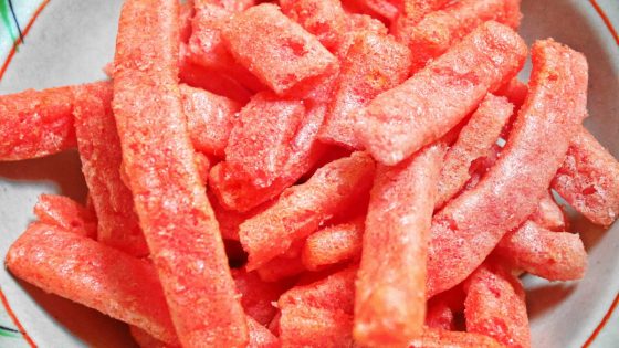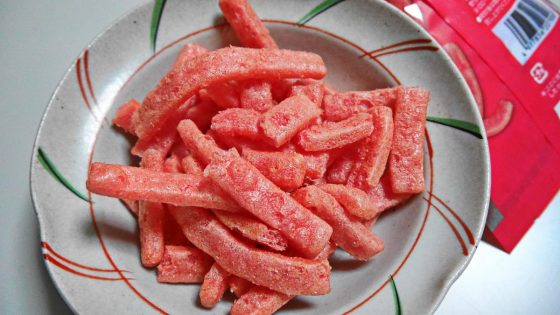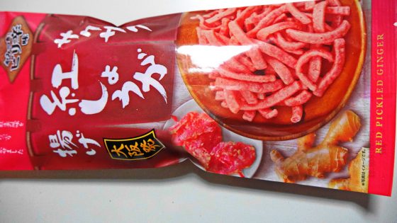 ちょっと見た目には、この赤色は赤色102号のようであるが、紅麹であるとわかって安心した。食べてみるとそれほど辛くはなくてお菓子の範疇。えびせんのように見えるけれど味は全く違ってしょうが味。なかなか美味しい。