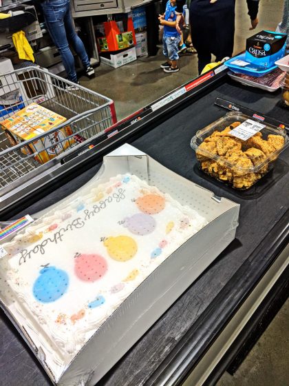 コストコでガソリンを入れるとマフィンの100円引きのティケットをくれる。マフィンとバースデイケーキを買って喜び勇んでレジに並ぶ。