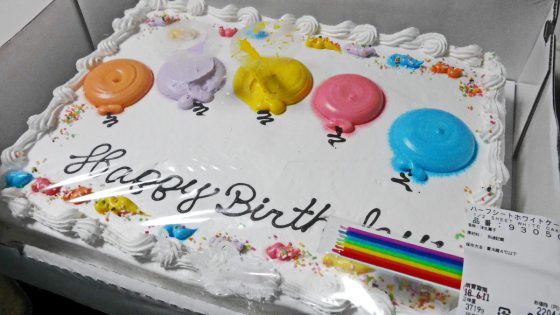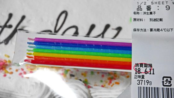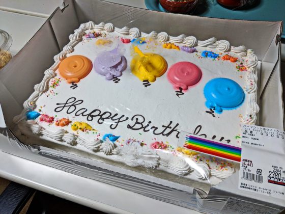 税込み2380円。普通のバースデイケーキの4倍ぐらいはある。これでハーフと書かれているということはオールなら一体どんな冷蔵庫に入れるのか。パーティ好きのアメリカ人ならこれも普通なのであろうが、3人家族でささやかに誕生日を祝う我が家では、考えられない大きさである。