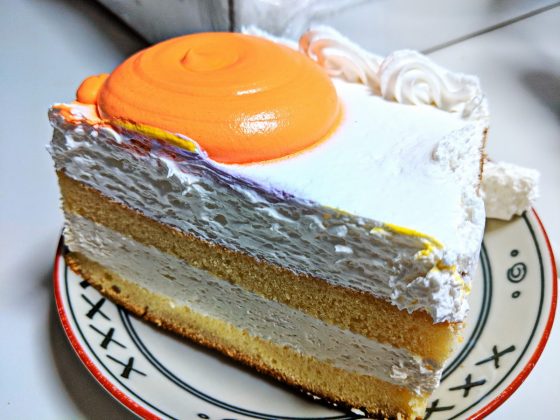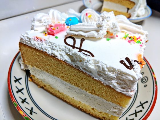 これは私。端っこの方をちょこっと切り分ける。食べてみると思った程まずくはないが特別美味しくもない。普通である。ケーキの部分が固くてしっかりしている。ただ、あまりたくさん食べるとクリームがカスタードクリームなので胸焼けする。弟は三分の一残した。それでも念願のコストコのケーキを食べることができて満足しているようである。