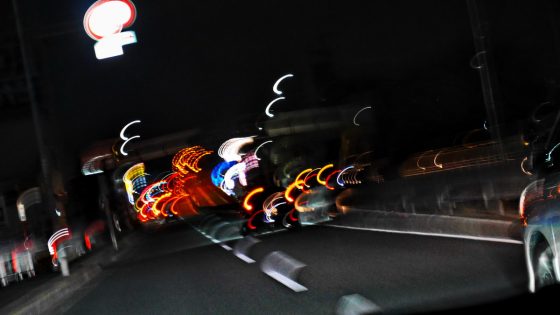 要するに、ピントが合っていないのである。ビュンビュン走っていく自動車のテールランプをこれ又動いている自動車の助手席からデジカメで撮るなんてうまくいかないのは当たり前だと思っていた。