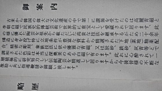 韓国青磁 月城窯 象軒兎栄 一についての経歴が詳しく書かれている。1940年生まれで1989年に至るまでのことが年代順に連ねている。