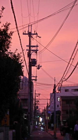 西の空は不気味なほど異様な赤紫である。街中が赤紫に染まっている。いま7時ぐらいだから30分ぐらい前までは一体どんな感じの空だったのか。早く撮らないとこの時間帯のトワイライトはあっという間に消えていく。