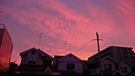 夕食を食べ終わって何気なく窓の方を見てみると、暗くなりかけた夕焼けの空が赤紫になって異様な風景に当たり一面を染めていた。なぜもっと早く気が付かなかったのかと後悔しつつカメラを持って家から走り出た。