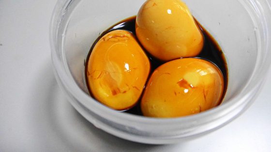 袋の中だとカメラでは写しにくいと思ってタッパーの中で漬けたのでつつき回して卵の表面に傷がついてしまった。