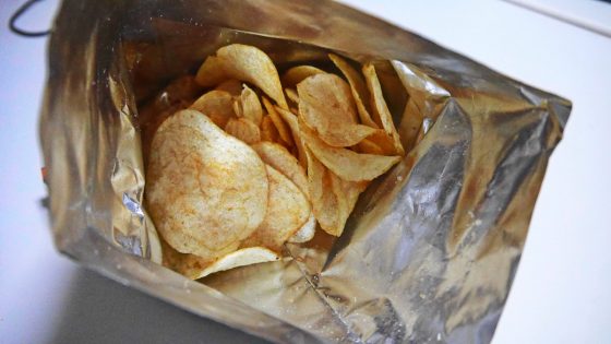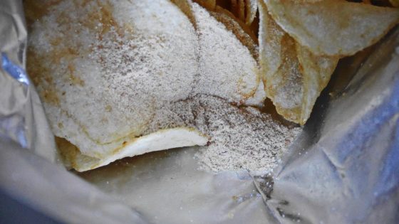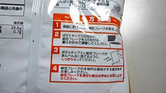 小袋の納豆フレークの粉末をポテチにふりかける。