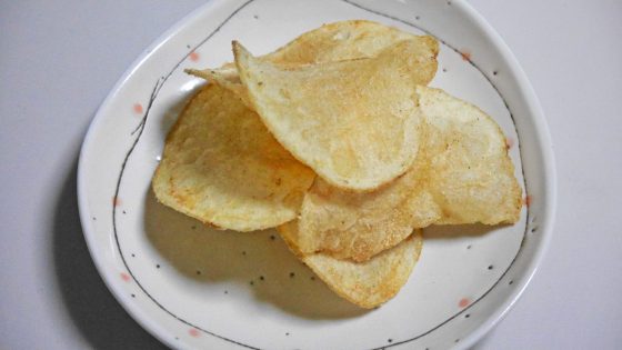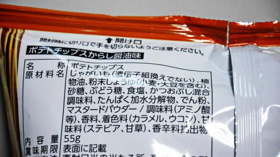 袋を開くとポテチ。からし醤油味だけのポテチを食べてみる。薄味でかなり美味しい。