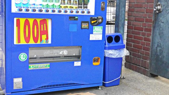 2つの自販機と平行に置かないで30度ぐらい傾いてゴミ箱さんを置いている。