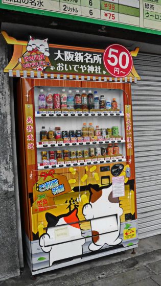 最後のこの得体の知れない自販機は「おいでや神社」。1段目はペットボトルの飲料水、2段めが缶入りだし汁(そばとかのだし汁)、3段目は30円ジュース。何故神社なのかよくわからない。