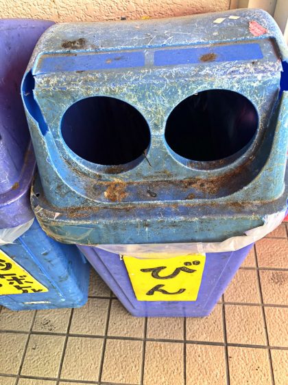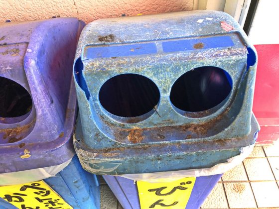 し、しかし、何という汚さ。割れたところをセロテープで貼ってはいるが、これではゴミ箱のフランケンシュタイン。ゴミより汚く汚れきったゴミ箱さんトリオ。趣味で自販機の二つ目ゴミ箱さんたちをいろいろ撮ってきたがこれは汚さナンバーワントリオである。