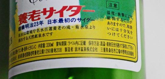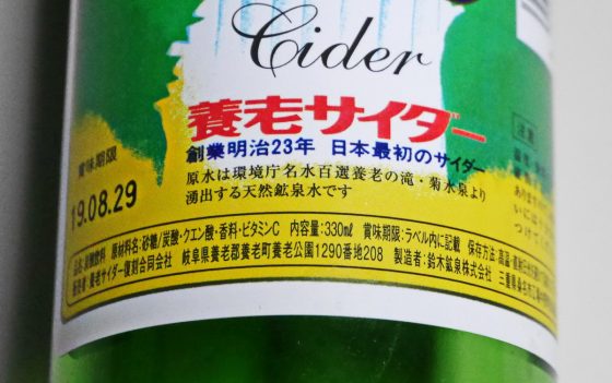 この養老サイダーは養老サイダー復刻合同株式会社( 岐阜県養老郡養老町養老公園1290-208)の復刻品であり、元は、日本最古のサイダーで明治23年に発売された。西日本の養老サイダーは東日本の三ツ矢サイダーとともに明治から昭和初期にかけて双璧をなした。