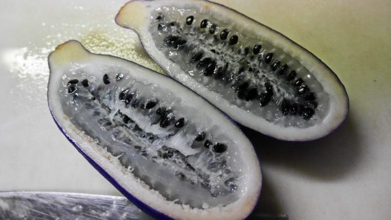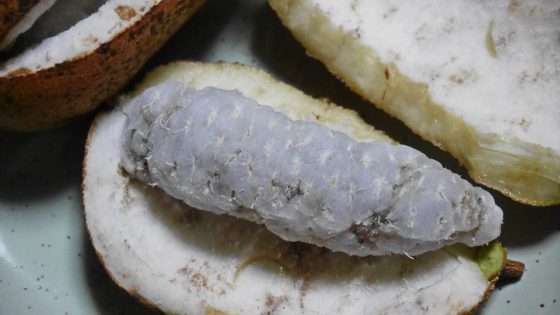 あけびの皮を割ると中から大型の幼虫のような実が出てくる。
