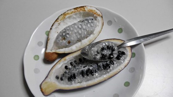 実が大きいと種も大きい。半透明の部分をスプーンですくって食べ、種は吐き出す。このあけびは種が大きいので出しやすかった。味は薄甘く淡泊で苦味は全くしない。
