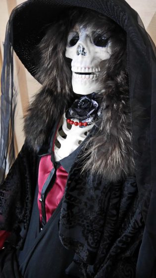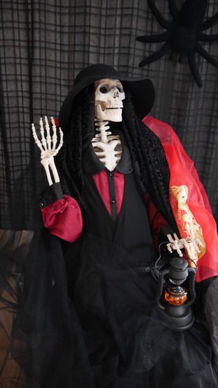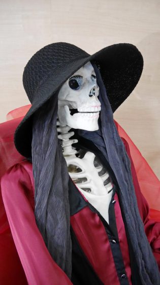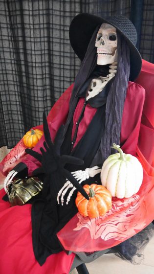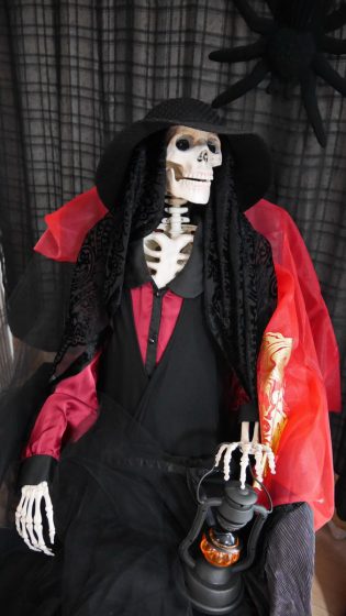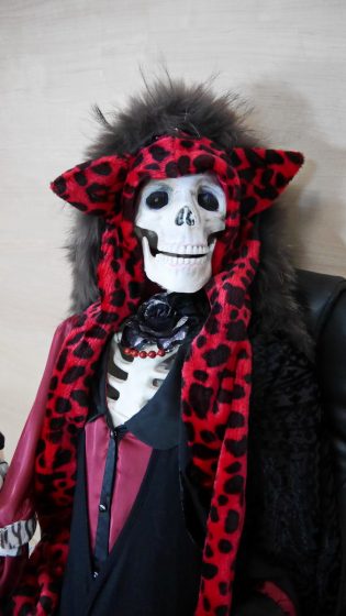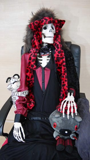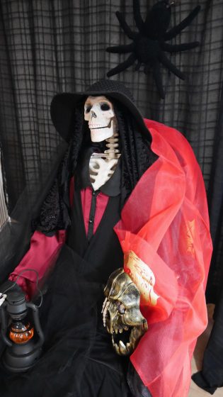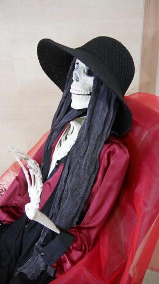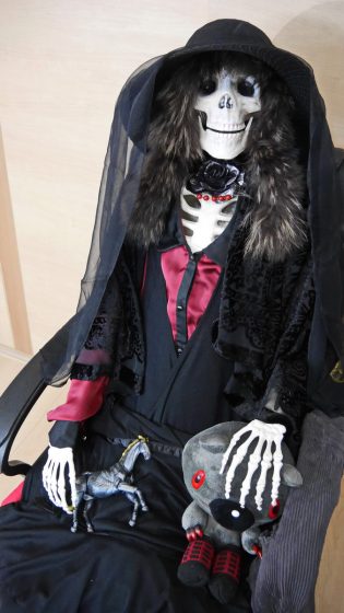 リサイクルショップで買い集めたものでガイコツさんをデコレイト。