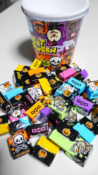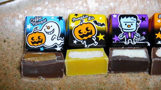 白いおばけはコーヒーヌガー、カボチャのランタンはパンプキンビス、フランケンシュタインはミルク味。